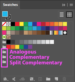 After creating the folder, click the Analogous Swatch Folder icon to select it. Now, any new color swatches you create will be saved right to this folder. (You can see the name of the folder by hovering over it, or by changing to a List view in the Swatches panel).