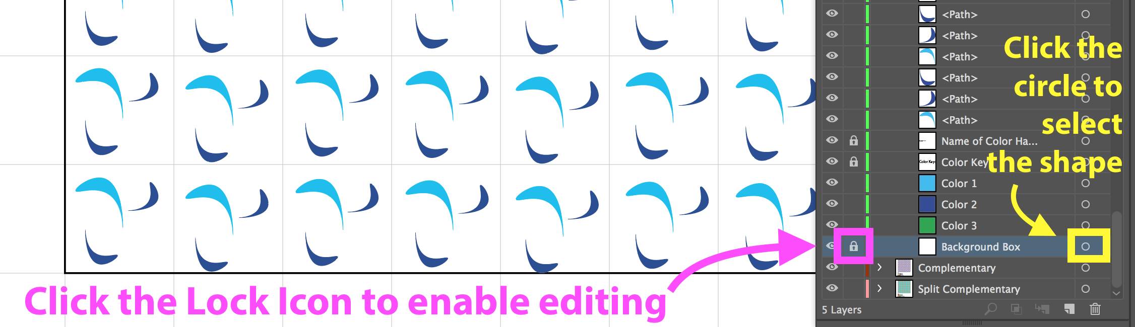 By default, this object is locked in our template file. To unlock it, go to the Layers panel and locate the “Background Box” item for that color group’s layer and click the lock icon next to the name.