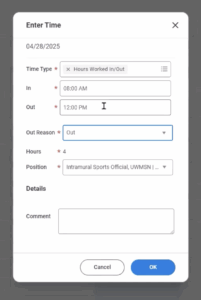 6. In the Enter Time box, change the Time Type to Hours In/Out and add your time. Out Reason can be “Out”. If you have multiple campus jobs, make sure you select the correct Position. Click OK.